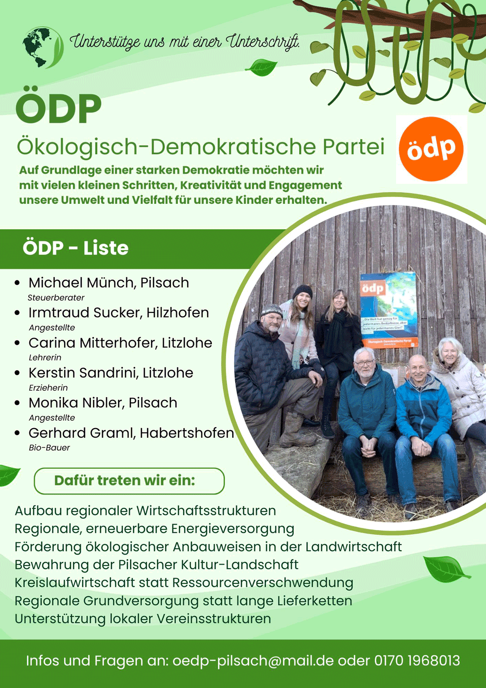 Für die ÖDP treten an: Michael Münch, Irmtraud Sucker, Carina Mitterhofer, Kerstin Sandrini, Monika Nibler und Gerhard Graml.