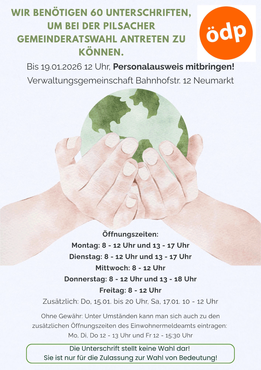 Da die ÖDP aber bislang nicht im Pilsacher Gemeinderat vertreten ist, muss sie die Unterschriften von 60 Unterstützern sammeln. Nur wenn sich bis zum 19. Januar 2026, 12 Uhr, ausreichend Bürgerinnen und Bürger in der Verwaltungsgemeinschaft in Neumarkt in die dort ausliegenden Unterschriftenlisten eintragen, wird die ÖDP zur Wahl für den Gemeinderat zugelassen. Die Eintragung ist in Pilsach selbst nicht möglich.